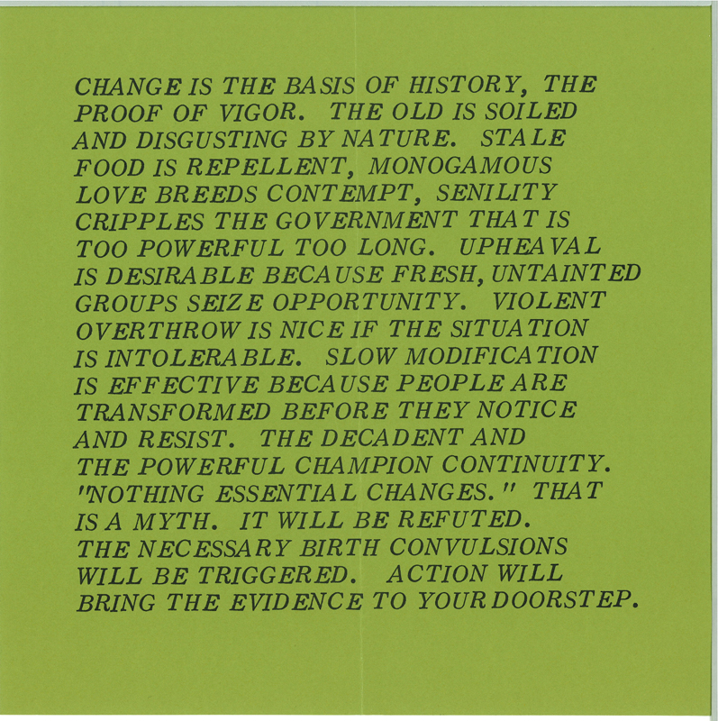 Jenny Holzer. Poster, 1982. [Pickle green background with black text that reads, "CHANGE IS THE BASIS OF HISTORY, THE PROOF OF VIGOR. THE OLD IS SOILED AND DISGUSTING BY NATURE. STALE FOOD IS REPELLENT, MONOGAMOUS LOVE BREEDS CONTEMPT, SENILITY CRIPPLES THE GOVERNMENT THAT IS TOO POWERFUL TOO LONG. UPHEAVAL IS DESIRABLE BECAUSE FRESH, UNTAINTED GROUPS SEIZE OPPORTUNITY. VIOLENT OVERTHROW IS NICE IF THE SITUATION IS INTOLERABLE. SLOW MODIFICATION IS EFFECTIVE BECAUSE PEOPLE ARE TRANSFORMED BEFORE THEY NOTICE AND RESIST. THE DECADENT AND THE POWERFUL CHAMPION CONTINUITY. "NOTHING ESSENTIAL CHANGES." THAT IS A MYTH. IT WILL BE REFUTED. THE NECESSARY BIRTH CONVULSIONS WILL BE TRIGGERED. ACTION WILL BRING THE EVIDENCE TO YOUR DOORSTEP."]