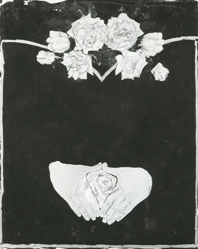 Gary Bower, White Bouquet, 1976. From Gary Bower, Fontaine Dunn, Hermine Ford, Artists Space, 1976. [A painting over a black background of a set of hands cupping a rose. Above, several more roses are pictured.]