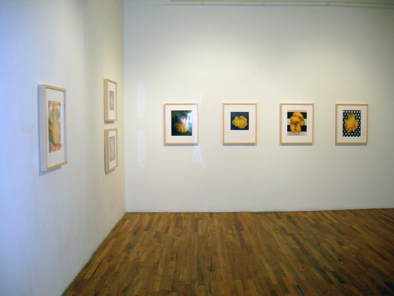 Local Transit. Installation view, Artists Space, 2006. [A corner made by two white walls. One wall has four framed images of yellow amorphus shapes on different backrounds, arranged in a horizontal line. The other wall has three framed images, one hung by itself and the other two stacked vertically.]