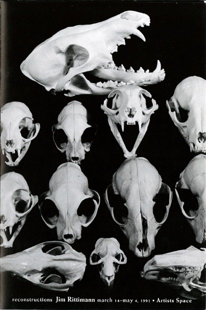 [Catalogue cover design featuring a black and white photograph of a series of animal skulls arranged on a back backdrop. The skulls vary in size and shape, and many have large, fang-like teeth. Small white text running along the cover's lower edge reads, "reconstructions Jim Rittimann march 14 - may 4, 1991 Artists Space."]