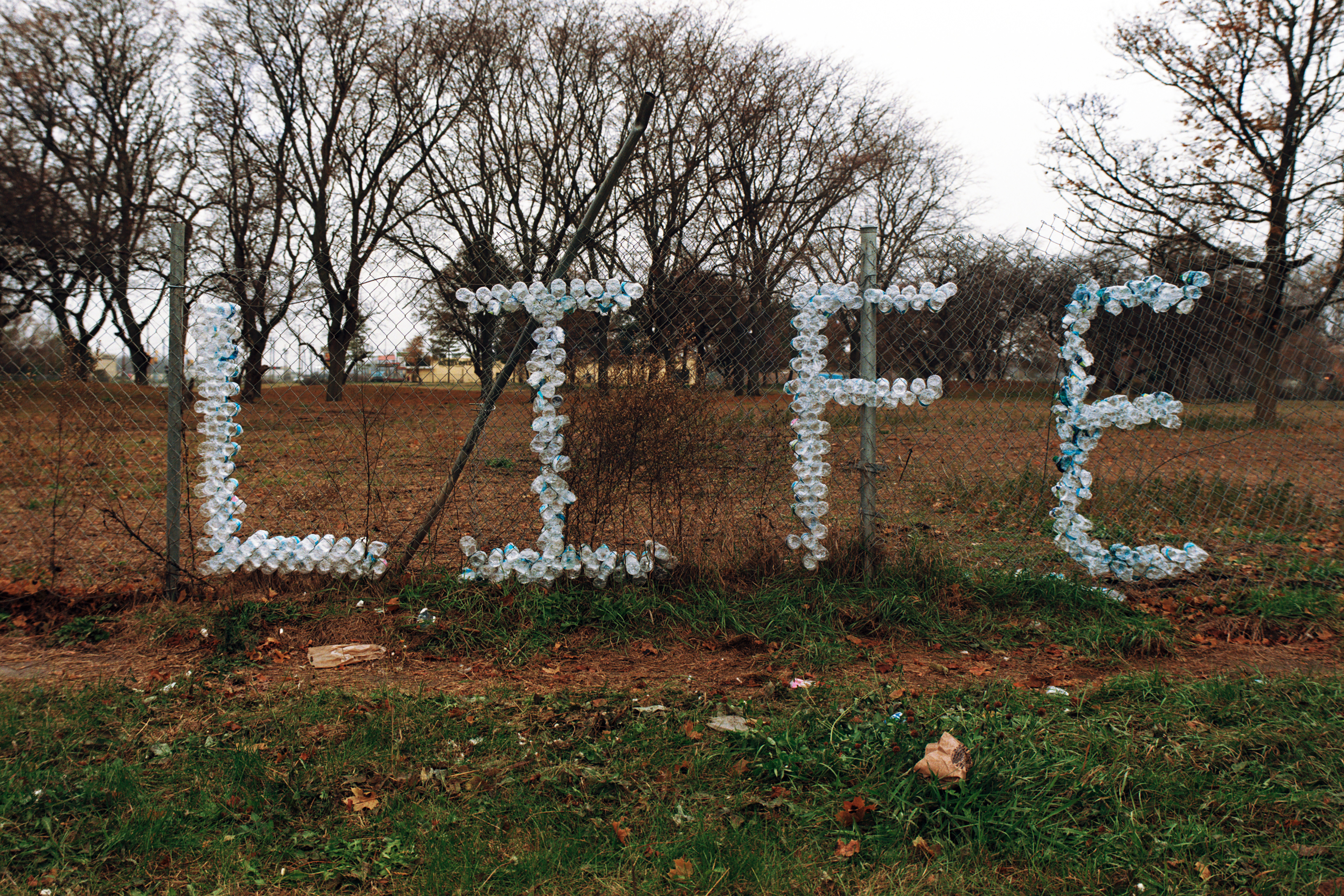 Caption LaToya Ruby Frazier, A Message In Nestle Water Bottles from Shea Cobb and Amber Hasan at Sussex Drive and West Pierson Road, Flint, MI, 2017/2023, set of three archival pigment prints on Canson Platine Fibre Rag, 16 x 24 inches (40.6 x 61 cm)