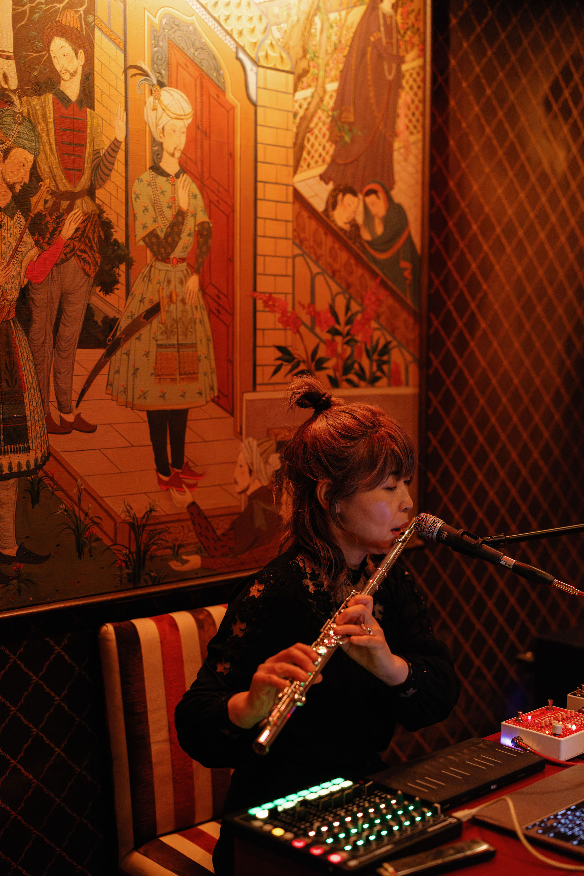 Image description Eleven musicians using electronic instruments sit at tables behind a stage. The room is dimly lit with blue lights on the wall. A performer stands on stage facing the musicians with a finger up in the air. In the foreground there are audience members.