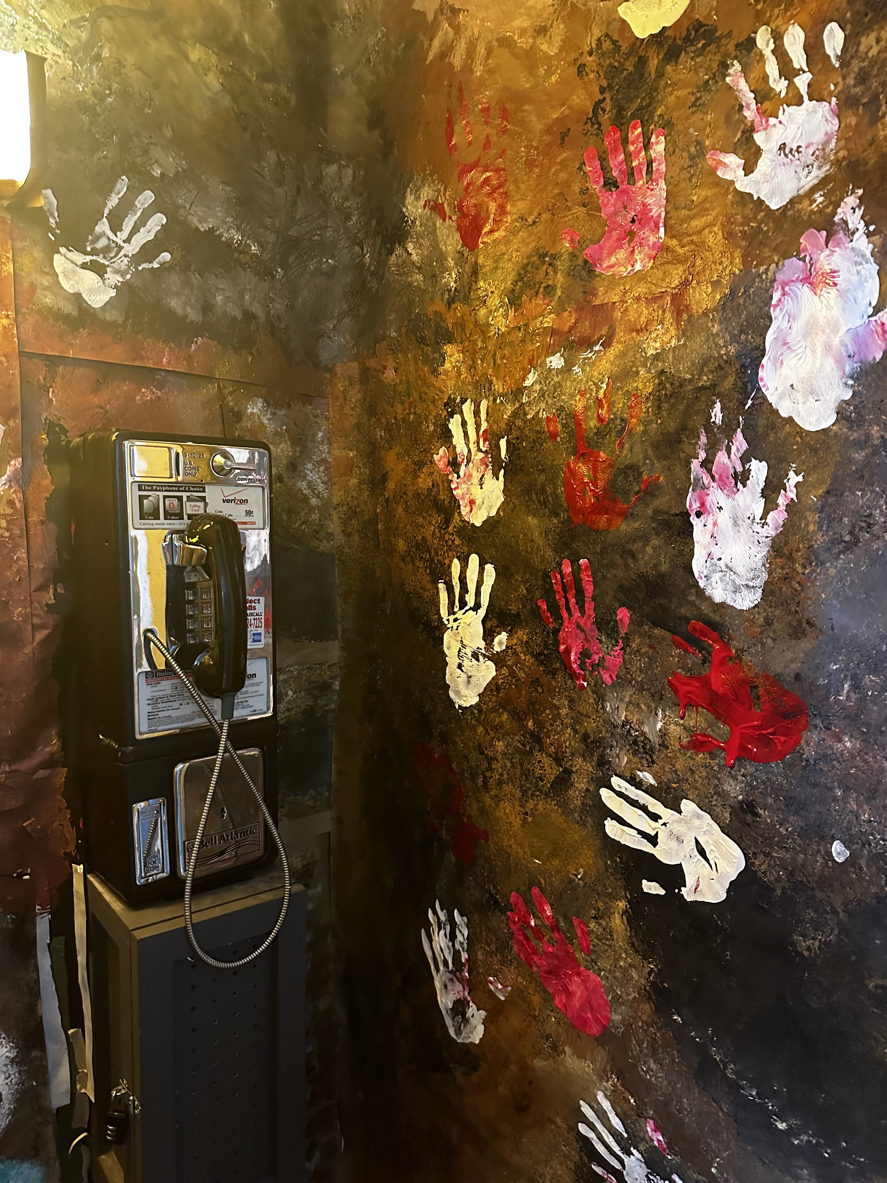 A long roll of paper is hung from the ceiling to the floor. The paper is filled with different symbols in a square grid format.