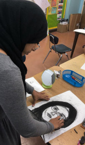 • Portraits of two figures are arranged side-by-side. On the left, a figure wearing a white shirt sits at a table with different objects spread out on its surface, speaking into a microphone. On the right, a black and white photo of a figures bust sits inside a larger black square.
