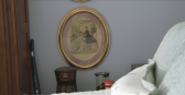 • A circular print of a painting hangs on a lavender wall. The painting depicts two white women wearing dresses with crinoline hoop skirts that appear to be from the antebellum period before the US Civil War, surrounded by a pink mat and a gold frame. It hangs over a coffee maker and next to a vacuum cleaner and a wood armoire. Bed pillows, positioned in the foreground, are lightly reflected in the glass of the print’s frame.