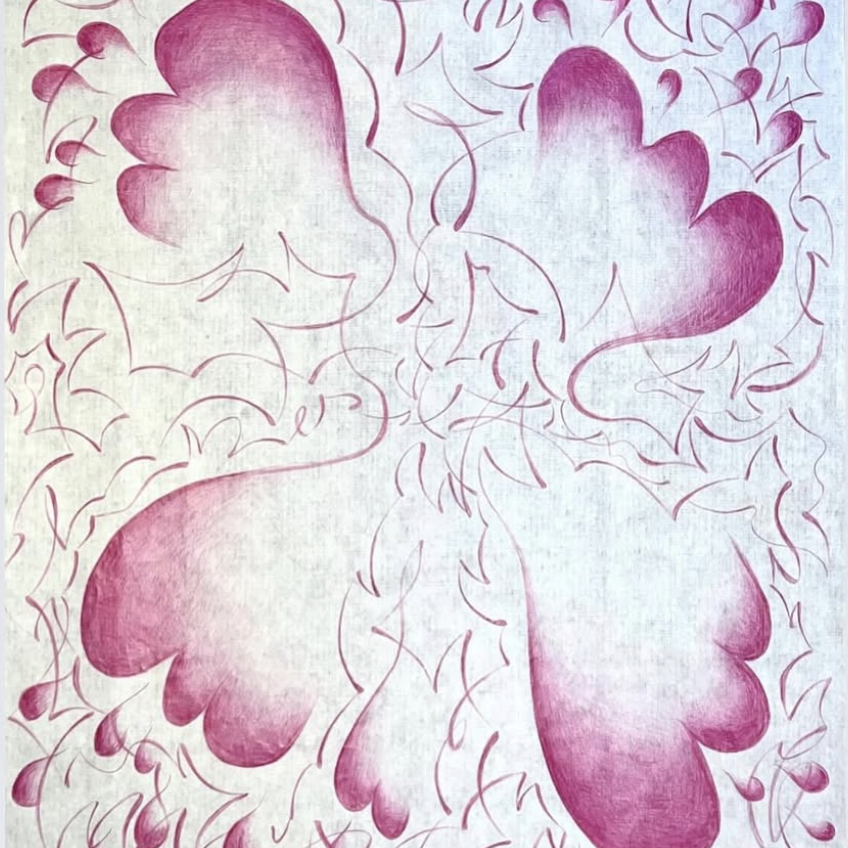 Two light blue panels of canvas displayed on a light mauve wall. The canvases are positioned side-by-side such that they form a square shape. Two semicircles are depicted on each of the canvases, which together form a white circle in the center of the two canvases. At the center of the circle, the edges of each of the canvases stretch outward to form two protruding flaps that curve towards and on top of the opposite canvases.