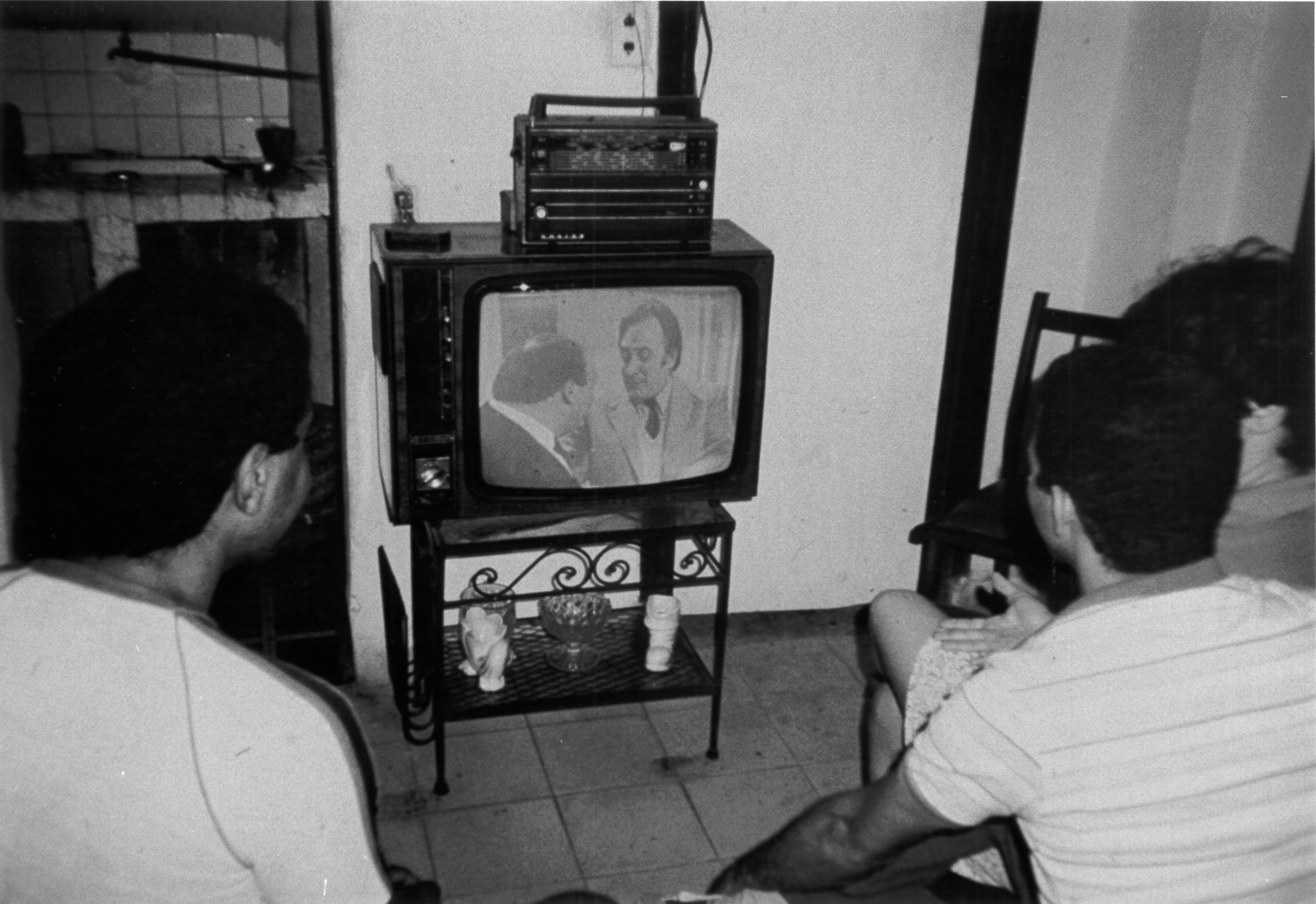 [A posterr with the silhouette of a man in the middle, dressed like a cowboy. Before him appear blue scan-lines, as if on a television set, which are boxed off into several rectangles.]