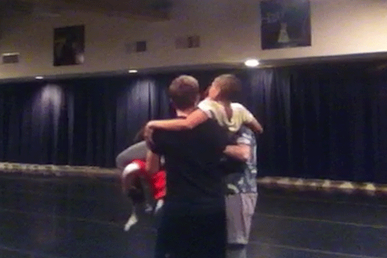 • Three figures perform in a basement. On the left a figure in a blue morph suit wears a pair of wings made of fresnel lenses. On the right another figure in a blue morph suit stands behind a rolling table made of wood and fresnel lenses. Another figure to the far right takes video footage.