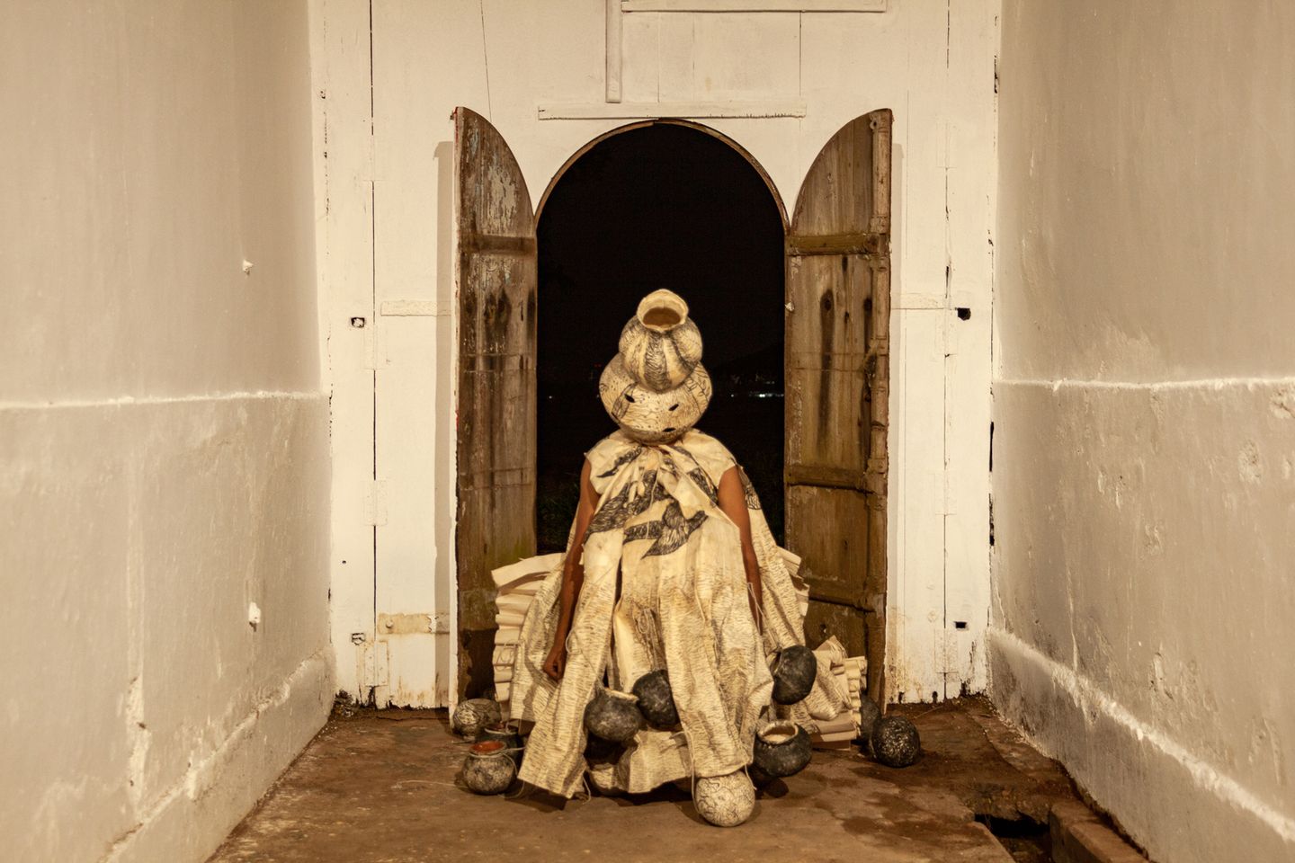 Image description A small black table leans at an angle, one corner resting on a white wall and one leg resting on an inflated balloon with a face printed on it. Coming out of the ballon is a flowered dress, attached to a fan by an inflation tube. Beyond that, visible behind a half wall, are two red shades with holes covering two windows.
