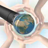 • A figure sits behind a table, looking at a laptop, and speaking into a microphone.