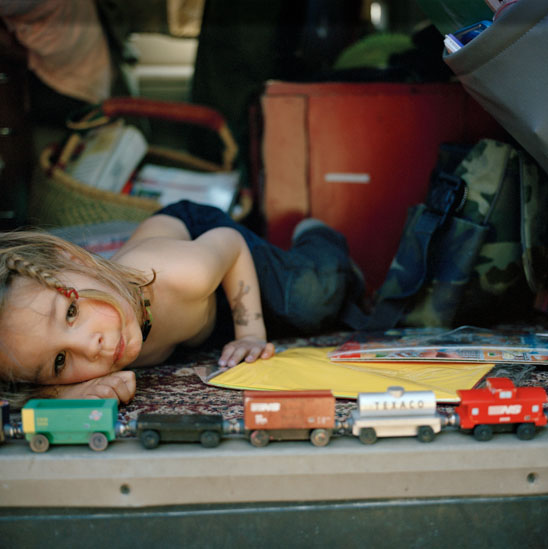 • A figure in three-quarter profile, wearing a beaded necklace and a blue shirt, gazes outside the frame. In the background is a blurry window, and a partially decipherable city-scape.