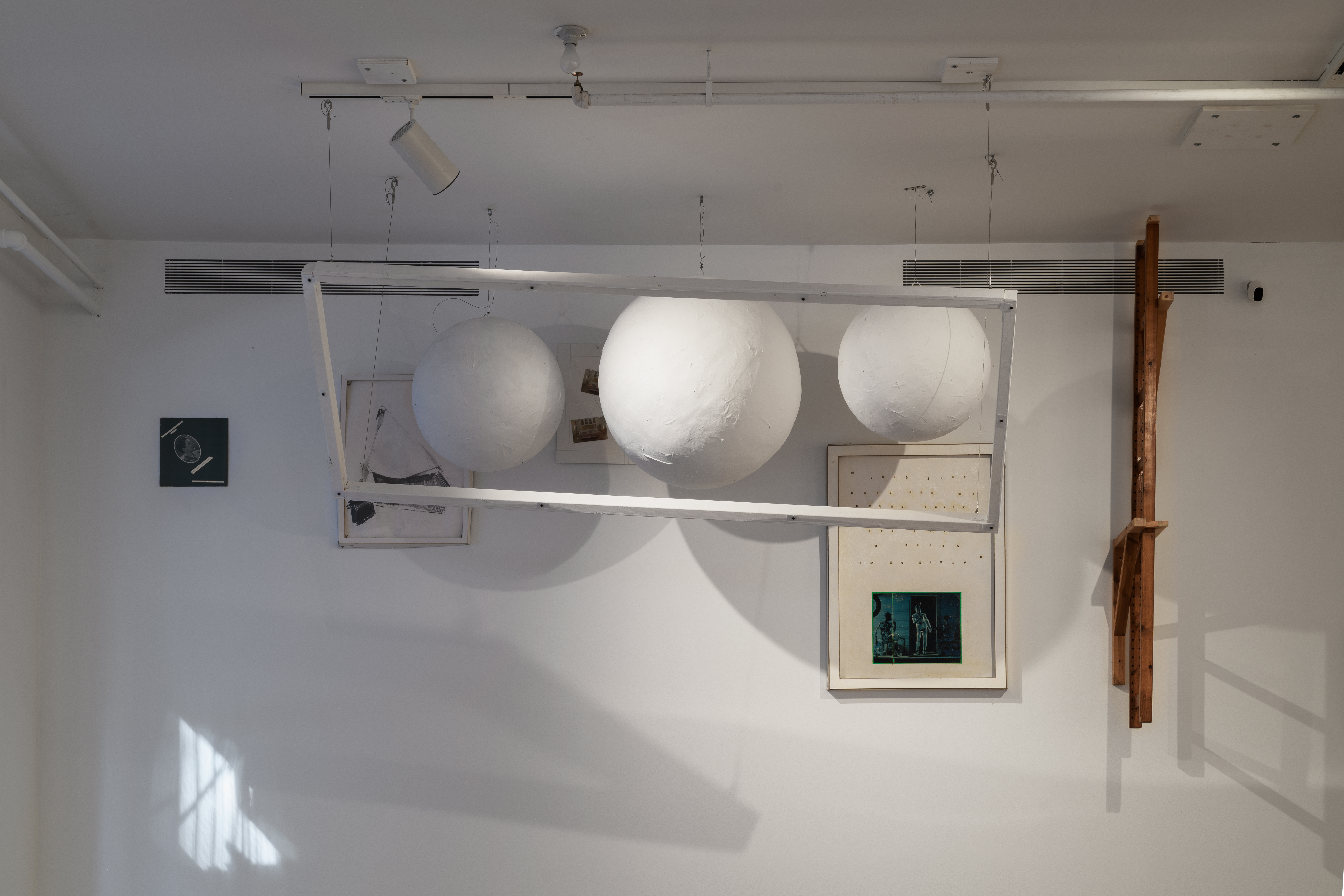 • A black and white photograph of a gallery installation. A figure poses in front of a wall with several hanging objects, their arms outstretched to either side.