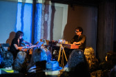 Yasunao Tone Concert #2. Performance documentation, April 13, 2023, Artists Space. Photo: Destiny Mata [Color image of a dark basement room. On the back wall is projected an image with Chinese characters, and English characters that read "Three Poems of The Tong Dynasty."]