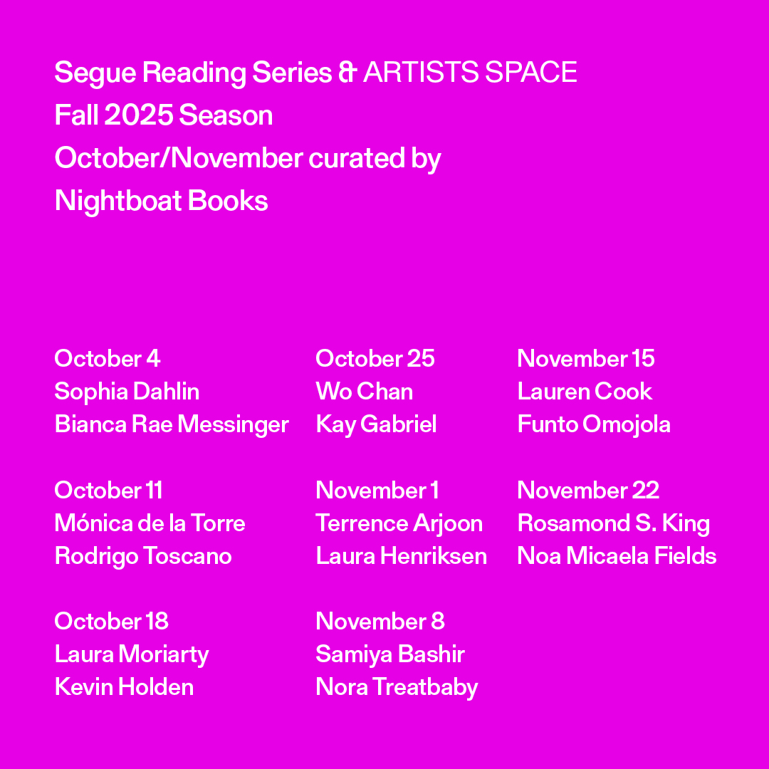 Segue and Artists Space are pleased to present the Fall 2025 Segue Reading Series curated by Nightboat Books: Lina Bergamini, Emily Bark Brown, Morgan Levine, Stephen Motika, Dante Silva. Nightboat is honored to present a selection of our poets whose work explores genre and resists boundaries. These authors' work joins Nightboat's list of books engaging the AIDS epidemic, eco-poetics, revolutionary poetry, black poetics, queer and trans archives, migration, healing and disability, and the New Narrative movement. The readings will take place at 11 Cortlandt Alley and online, on Saturdays at 5pm.