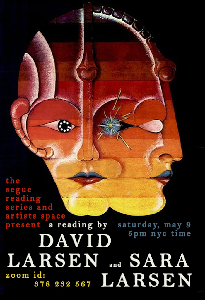[A rendering of a head with two faces, one positioned head-on and the other seen in profile, is made from gradient strips of red, orange and yellow color. Dissecting lines and geometric shapes define the face's blocky features. The top lips are blue and the bottom red, while the left eye is black with a white dial and the right eye is a hazy blue with yellow lightning coming out of it. Under the image, text in red, white, blue serif font reads: the segue reading series and artists space present / a reading by David Larsen and Sara Larsen / saturday, may 9, 5 pm nyc time / zoom id: 378 232 567.]