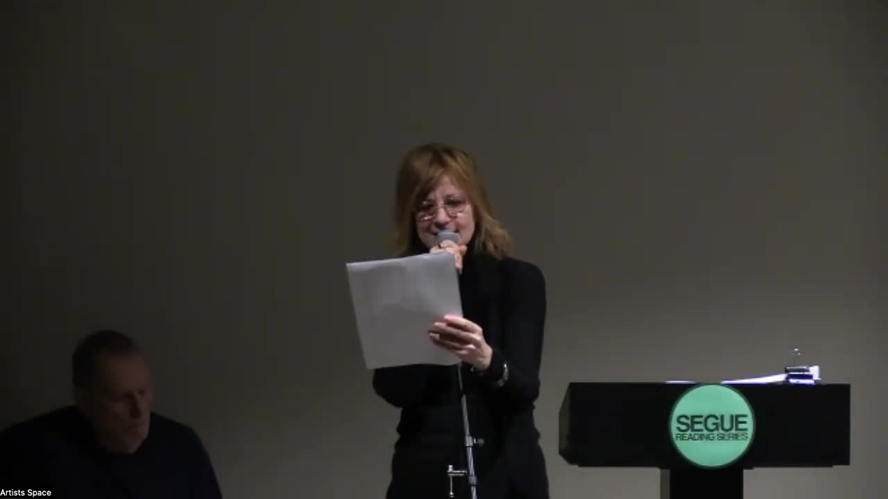 Mónica de la Torre: I ❤ John Giorno: John Giorno, Fanny Howe, Mónica de la Torre. Reading documentation, June 23, 2017, Artists Space. [Video documentation of a woman reading from a book in front of a microphone.] -